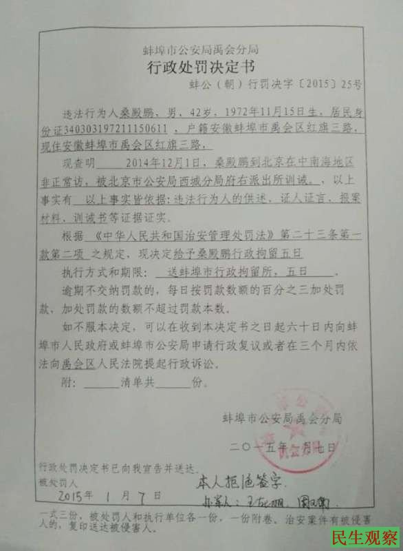 民生观察工作室2015-1-8消息:桑殿鹏是安徽省蚌埠市禹会区的一名上访警察,可昨天他却被蚌埠市禹会区行政拘留五天。