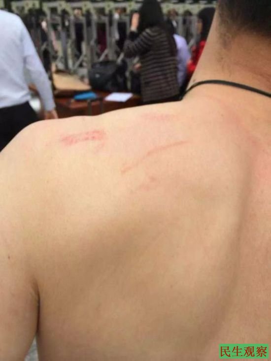 “王甫一下车就被一群人围住了,好多女的,三四十岁左右,也有男的,有的拽腿有的抱腰,然后几个撕扯他的衣服,拽头发,用指甲就这样抓脸抓身上,根本动不了。我在一旁拍照,被他们看到了,几个人冲过来抢我手机,也拽我头发,不止脖子上,我手臂上也有。”他卷起袖子,袖子也被扯烂了,手臂上面是很粗的一个红道道。看完伤情后,他给我看了他拍到的照片。有好几名群众围过来,说他们拍到了照片和录像,可以提供给我们。
