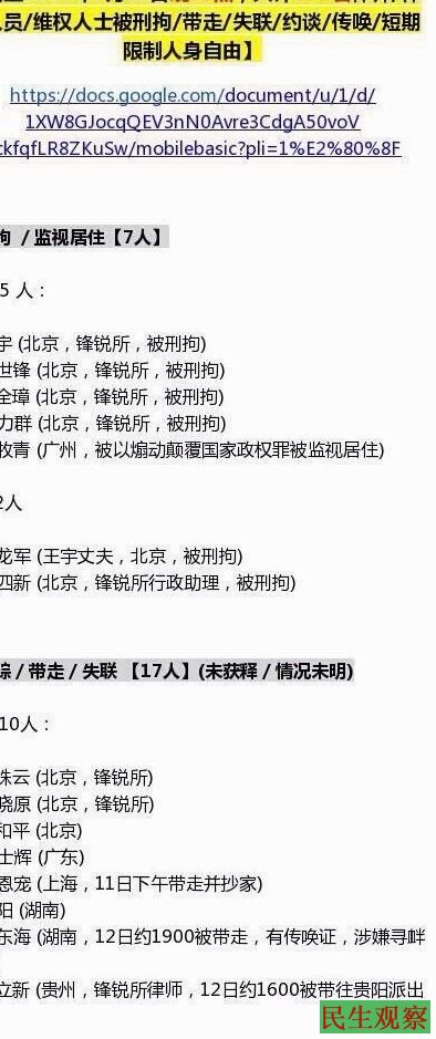 民生观察工作室2015/7/14消息:今天中午,武汉网友、拆迁维权人士彭永胜告诉本工作室,昨天凌晨二点左右他往QQ群里转载了二张近期国内律师被大规模关押、失踪、约谈的图片信息。今天上午10点44分,他就接到他所在的武汉东湖开发区关南派出所警察的电话,称他们接到网监通知,调查图片是不是他发的。