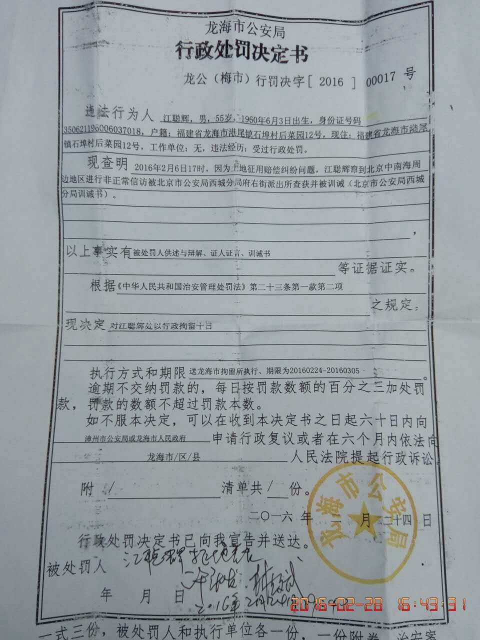 福建省龙海市江聪辉、陈亚英、江解放中南海上访被拘留