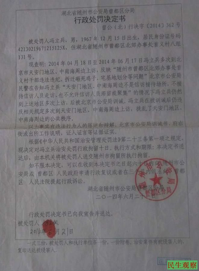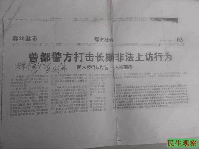 民生观察工作室2016/4/7消息:近日,湖北省随州市民高朝雄、靳云会向本工作室反映,他们因上访维权遭到非法拘留、关押。