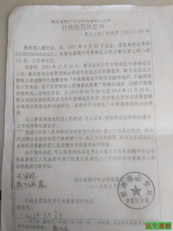 2014年6月这次被拘留,靳云会夫妇还被鄂北都市报“曝光”。就2015年3月这次被拘留,靳云会曾向随州市曾都区政府提起行政复议,结果是拘留合法。