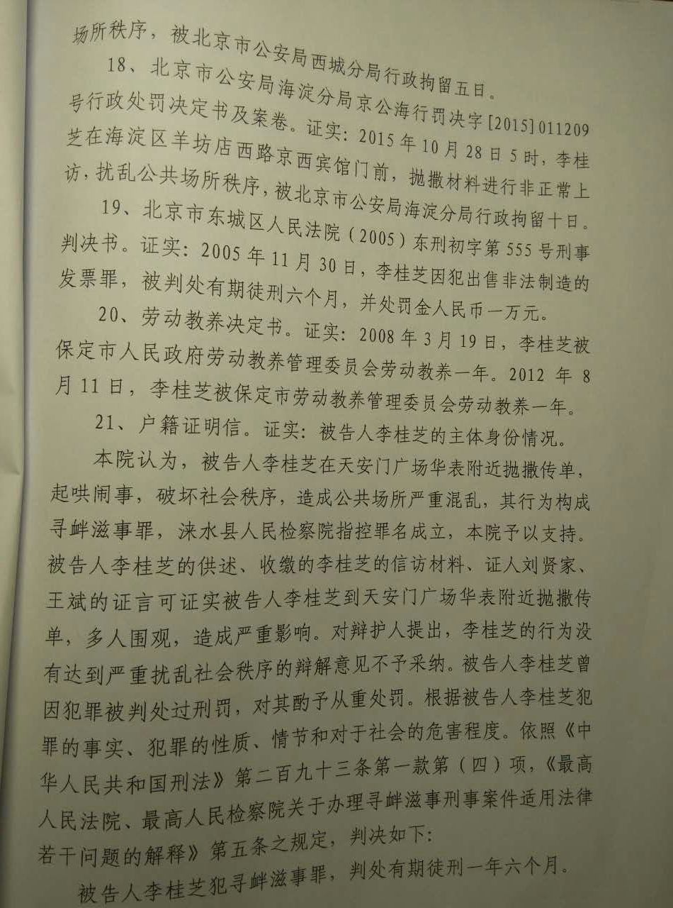 河北访民李桂芝以寻衅滋事罪被判一年半 |