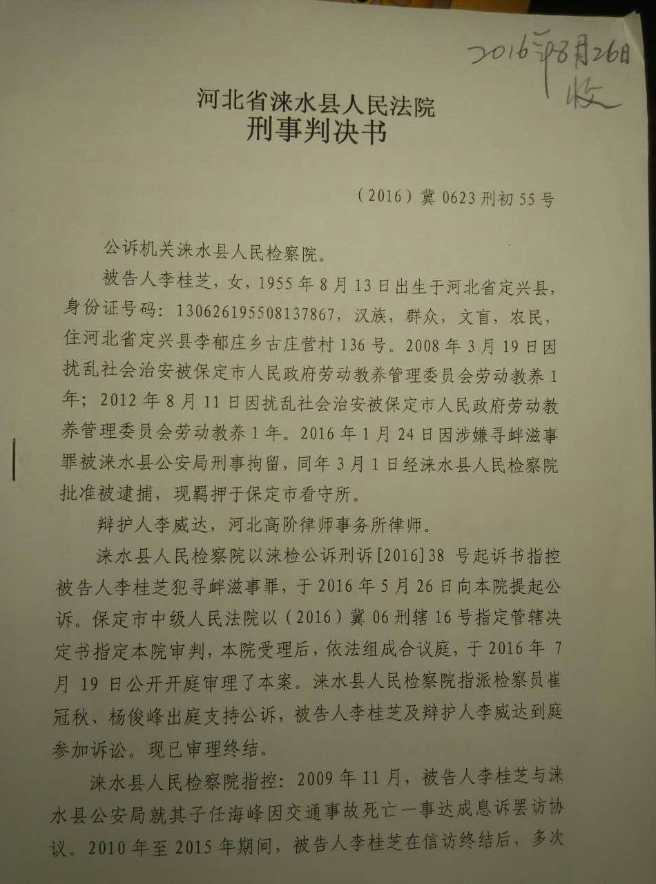 民生观察工作室2016/8/27消息:昨天,李威达律师收到了河北保定涞水县访民李桂芝因上访被寻衅滋事一案的判决书,涞水县法院一审判处李桂芝有期徒刑1年6个月。