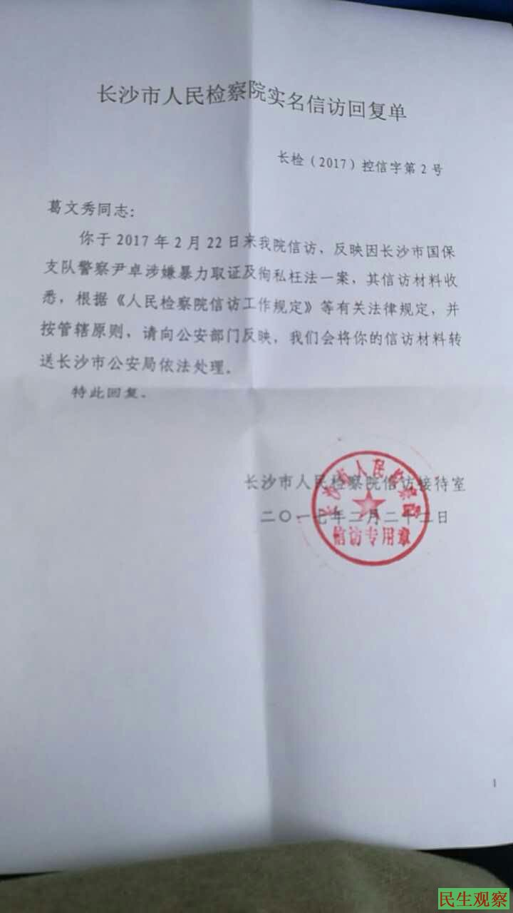 葛文秀还要求检察院查询去年8月以来,三次对长沙市检察院的李治明、长沙市第二看守所所长尹志良的控告结果。但对方答复称,在他们的电脑系统中没有相关的投诉信息。