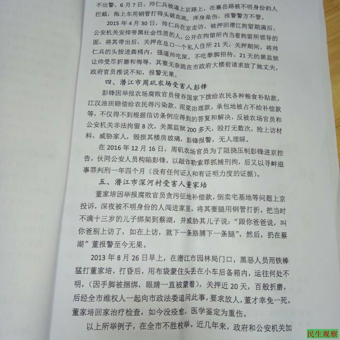 彭峰说:“我们寻找‘中央巡视组’主要是揭露潜江动用黑社会形式的强拆与维稳,在维稳过程中多人遭到绑架失联,在失联中遭到残暴的殴打”。