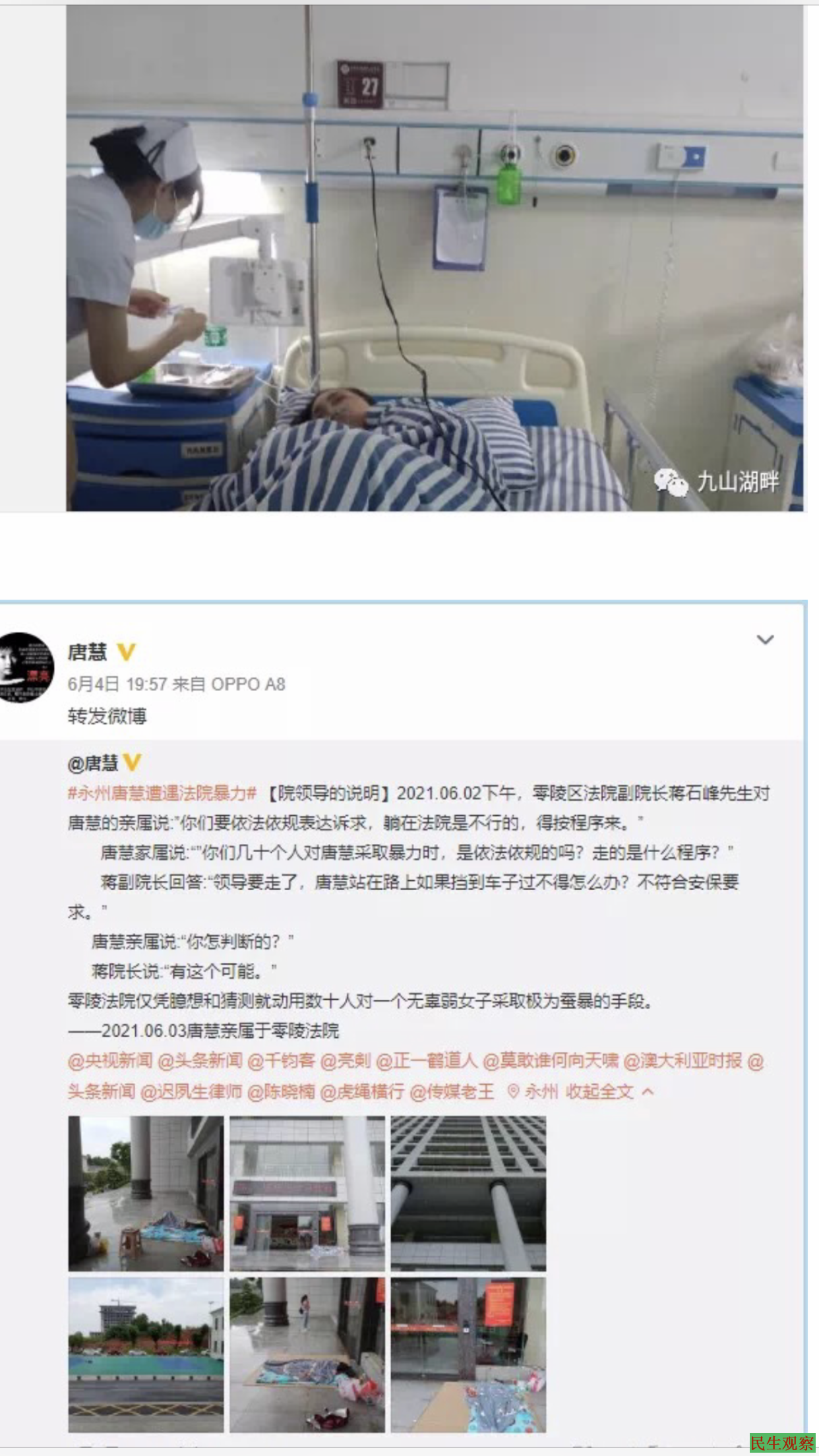 据唐慧亲属发的微博显示,零陵区法院仅因为唐慧站在路上,怕挡了领导的道,使领导的车不能顺利通过,不符合安保要求,所以才对唐慧施暴的。