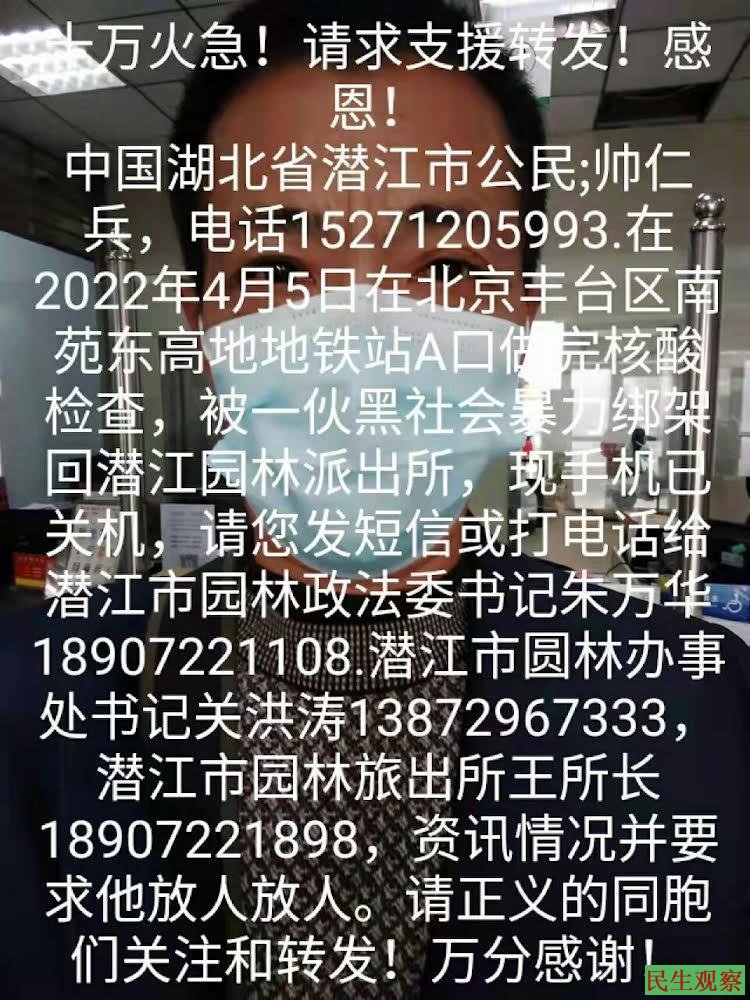 【民生观察2022年4月8日消息】2022年4月5日帅仁兵发出求救信息,一万火急!请求支援转发!感恩!中国湖北省潜江市公民帅仁兵电话15271205993,在2022年4月5日在北京丰台区南苑东高地地铁站A口做完核酸检查,被一伙黑社会暴力绑架回潜江园林派出所,现手机已关机,请您发短信或打电话给潜江市园林政法委书记朱万华18907221108,潜江市圆林办事处书记关洪涛13872967333,潜江市园林旅出所王所长18907221898,资讯情况并要求他放人放人。请正义的同胞们关注和转发!万分感谢!
