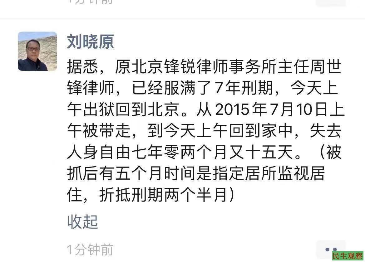 据悉,原北京锋锐律师事务所主任周世锋律师被以颠覆国家政权罪判处有期徒刑7年,剥夺政治权利5年。他于2015年7月10日被抓,被指定监视居住大约五个月,实际关押7年多,于今日9月24日刑满获释。