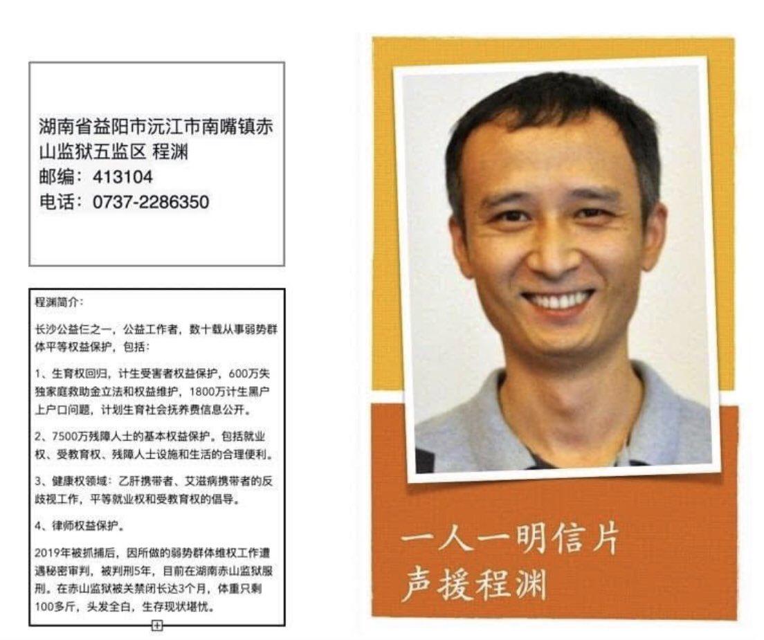 请朋友们继续关注程渊,他还要在赤山监狱渡过一年5个月的时间。烦请朋友们写信,寄明信片给他。