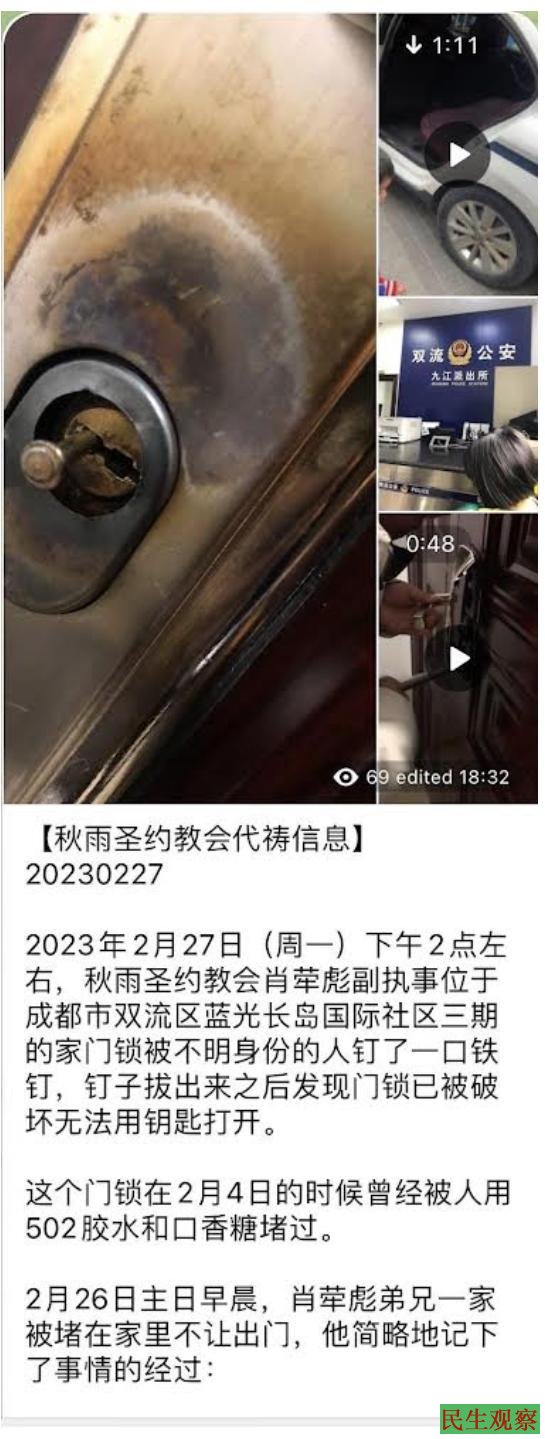 【民生观察2023年2月28日消息】2023年2月26日主日,位于中国四川省成都市的秋雨圣约教会肖荦彪副执事一家被堵在家里不让出门;27日下午,肖荦彪副执事的家门锁被不明身份的人钉了一口铁钉,钉子拔出来之后发现门锁已被破坏无法用钥匙打开。之后,肖荦彪弟兄叫来开锁公司撬开门锁,进了房间以后发现被断水断电了。报警后,派出所未有任何实质性的帮助和回应。