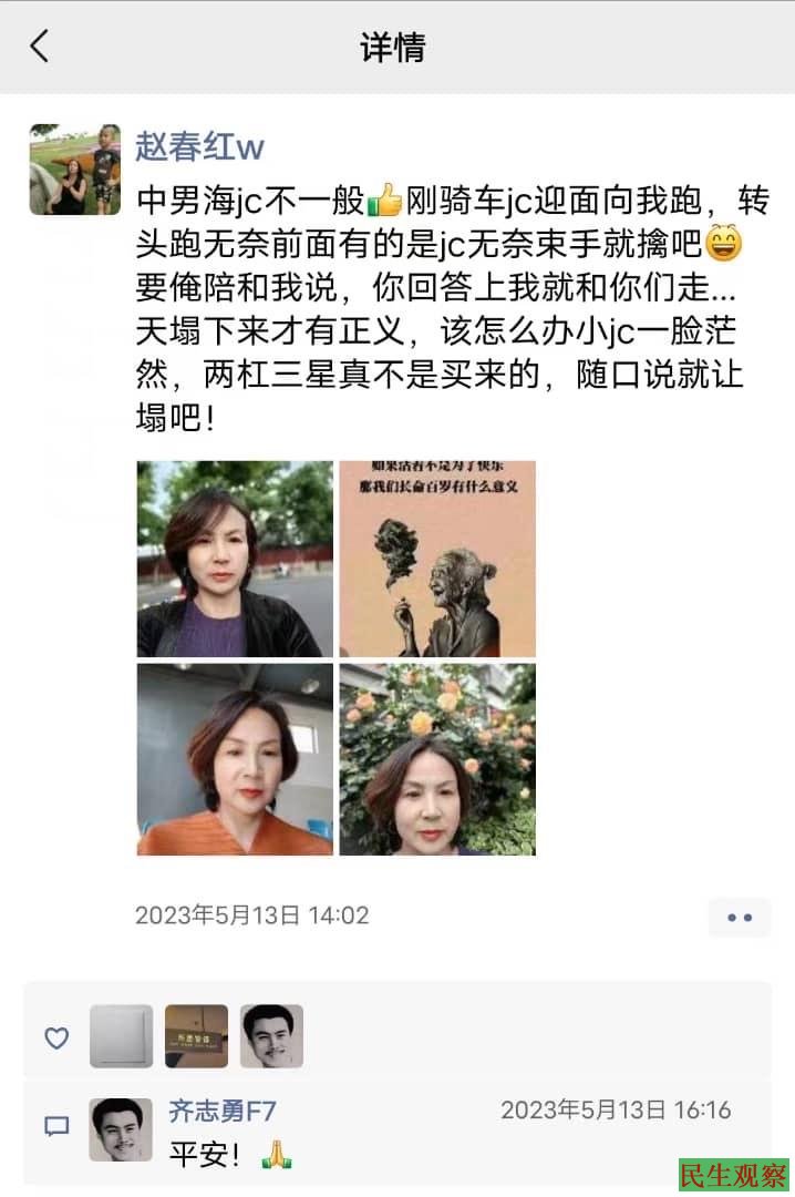 【民生观察2023年5月19日消息】河北平泉维权人士赵春红因“5月12日”到国家信访局打卡,当天晚上就被北京警察拦截限制了自由等待当地政府部门交接,晚上21点30左右她当时给朋友留言说:这么晚了嘛滴说要来接她还没有来,随后就失去联系了,在北京被抓捕后,连夜遣返回当地,由河北省平泉市公安局以“涉嫌寻衅滋事罪”刑事拘留,目前关押在承德看守所。