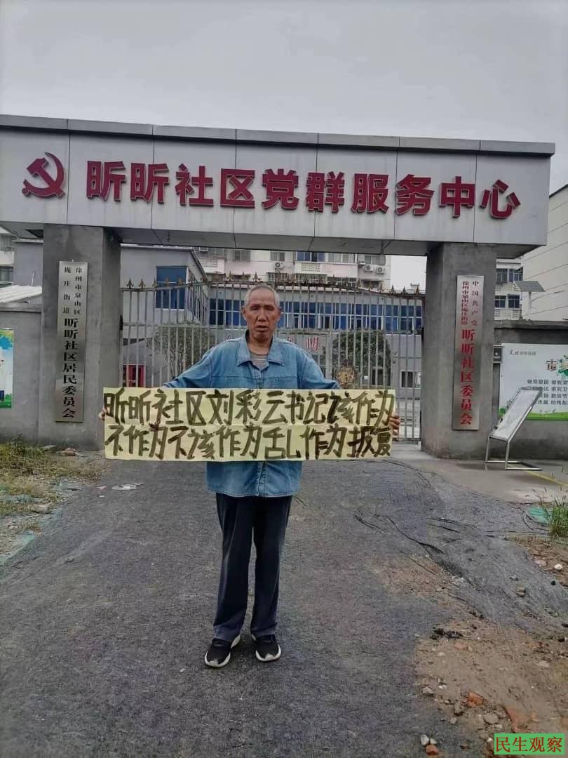 【民生观察2023年9月29日消息】中秋佳节来临之际江苏邳州市维权人士吴继续给徐州市信访局局长赠送锦旗,“光明大道,引领一条”,徐州市信访局局长拒绝接受赠送的锦旗,吴继续举牌抗议社区领导“该作为的不作为,不作为的胡作为”,江苏邳州市维权人士吴继新因合同纠纷一案,自建厂房所有设备被政府侵占维权近20年无果,多次被抓铺刑事拘留遭到两次构陷判刑,劳教一次,无数次从北京被抓铺遣返回当地关押。9月5从北京被遣返回来的吴继新一直都在徐州市各部门之间来回奔波无人解决问题。