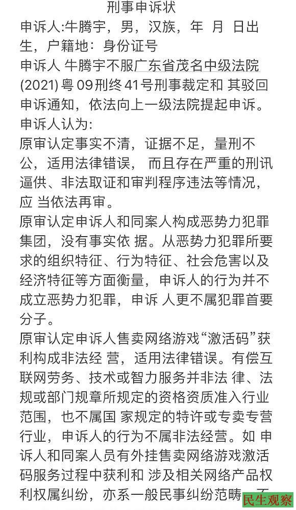 牛腾宇不服广东省茂名中级法院(2021)粤09刑终41号刑事裁定和其驳回申诉通知,依法向上一级法院提起申诉。