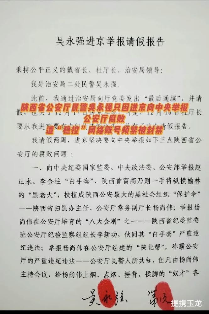 吴永强请假两周,进京坚决要向中央举报如下三点陕西省公安厅的腐败问题: