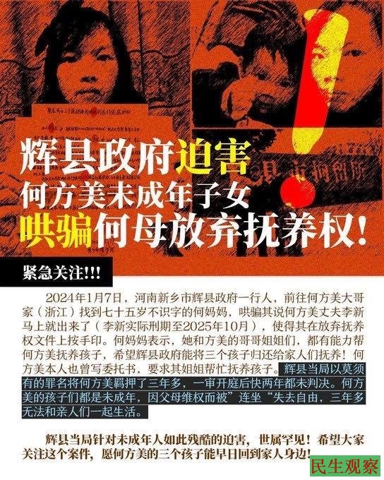 【民生观察2024年1月11日消息】近日,河南新乡辉县政府人员哄骗因疫苗维权而入狱的人权捍卫者何方美的母亲,在放弃孩子抚养权上按手印。网友呼吁,请大家紧急关注被辉县政府迫害的何方美的未成年子女!