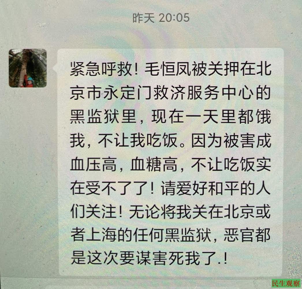 【民生观察2024年2月23日消息】近日,上海维权访民毛恒凤等人进京上访被北京警方拦截查身份证,后被送到北京永定门救济服务中心关押,期间不给饭吃,昨天毛恒凤被上海市驻京办人员接出来,今天乘坐火车已经到达上海,目前后续情况不知。而另一上海访民丁菊英被押送回上海后,现已被关进黑监狱。