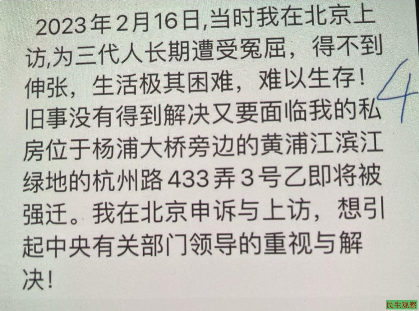在2023年2月16日我在北京上访,在军人事务部里为抗日烈属母亲因为烈士的牺牲,而一生没有工作与住房,最后被惨害致死!说明情况,期盼得到中央军委领导层的重视与解决。当日在反映情况结束后,我就被军人事务部的工作人员拦住不让我走,通知当地派出所岳各庄派出所警察拦截了我,不让我离开,直至交给了上海驻京办再转交给杨浦驻京办工作人员,将我强制押回上海。