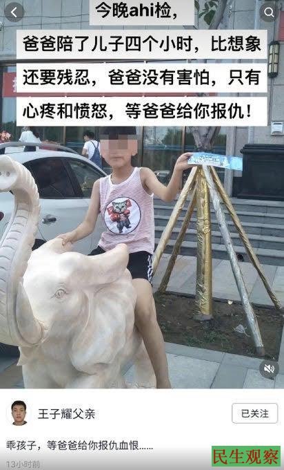 王子耀父亲在18日凌晨5:35分发了一张王子耀儿时的照片,并配文“乖孩子,等爸爸给你报仇雪恨”。