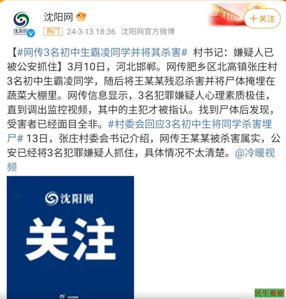 【民生观察2024年3月21日消息】近日,河北省邯郸市肥乡区北高镇张庄村三名初中生霸凌同学,随后将受害者王子耀残忍杀害并将尸体掩埋在蔬菜大棚里。受害者家属到事发地维权被警察维稳,网上开直播发声账号立马被封禁。家属聘请的代理律师表示,目前孩子遗体已经完成尸检,尸检报告还在等待中。