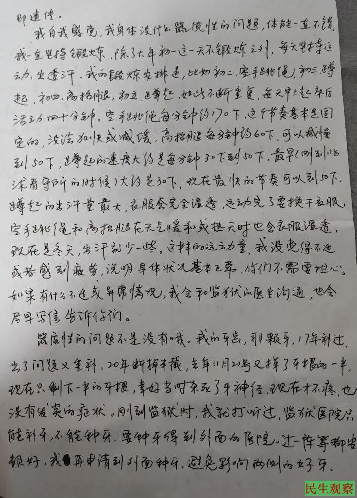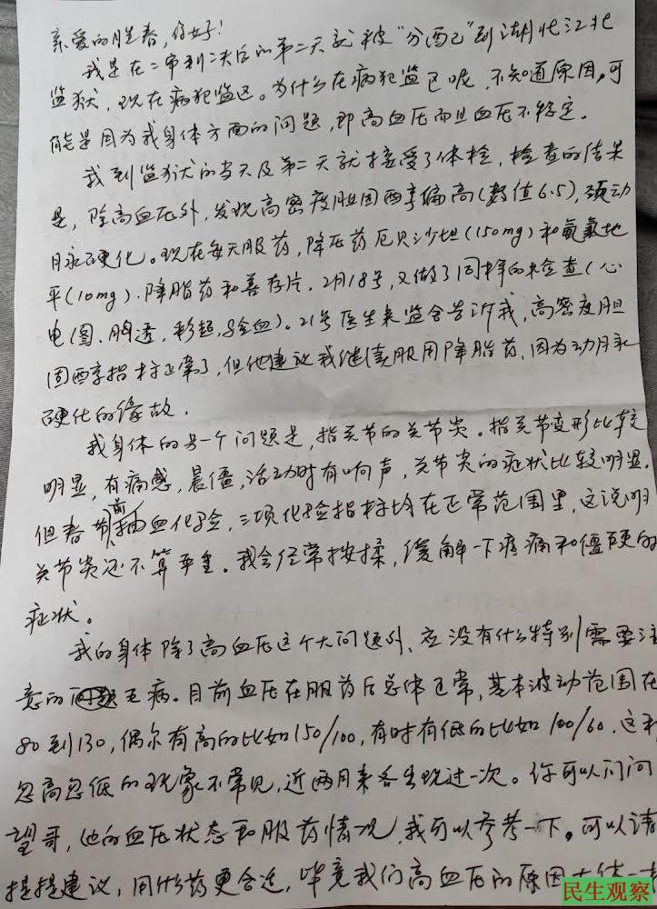 家喜在信中说,他是在二审判决的第二天就被“分配”到湖北江北监狱,现在病犯监区。为什么在病犯监区呢,他也不知道原因,可能是因为他身体方面的问题,即高血压而且血压不稳定。