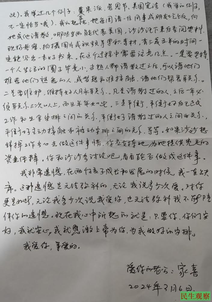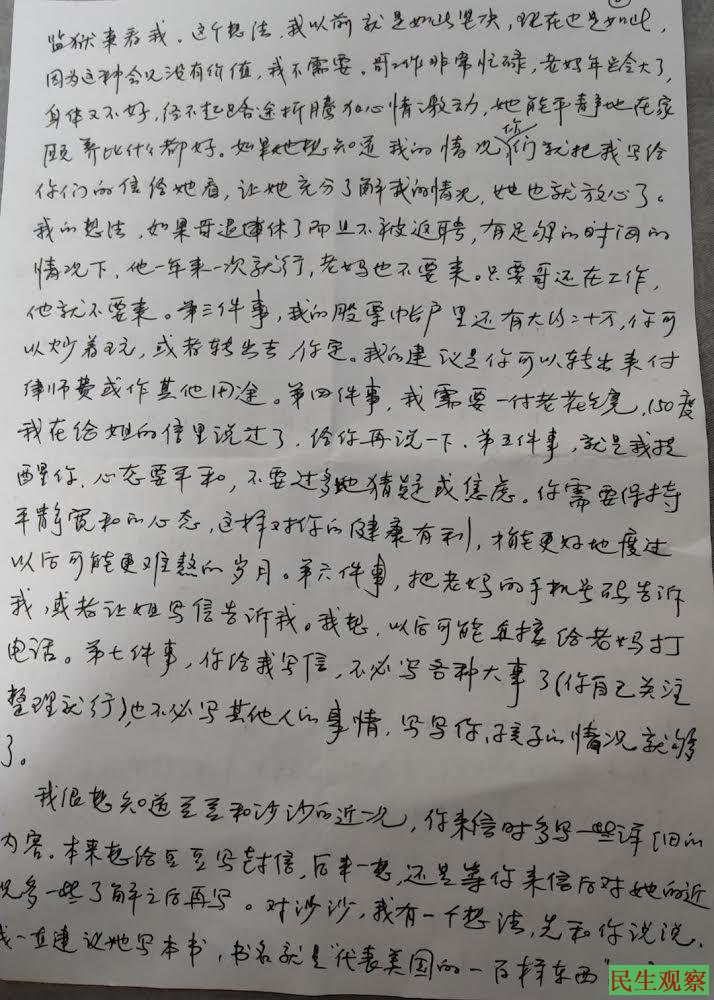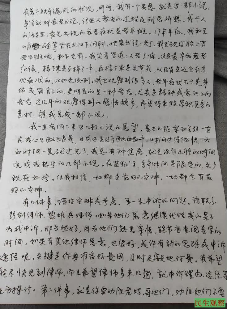 【民生观察2024年3月30日消息】近日,人权律师丁家喜的家人收到了他从湖北江北监狱寄来的信件。家喜在信中主要讲述了自己的身体情况以及在监狱的日常情况。从信中家人可以大致了解家喜在监狱的样子和状态。