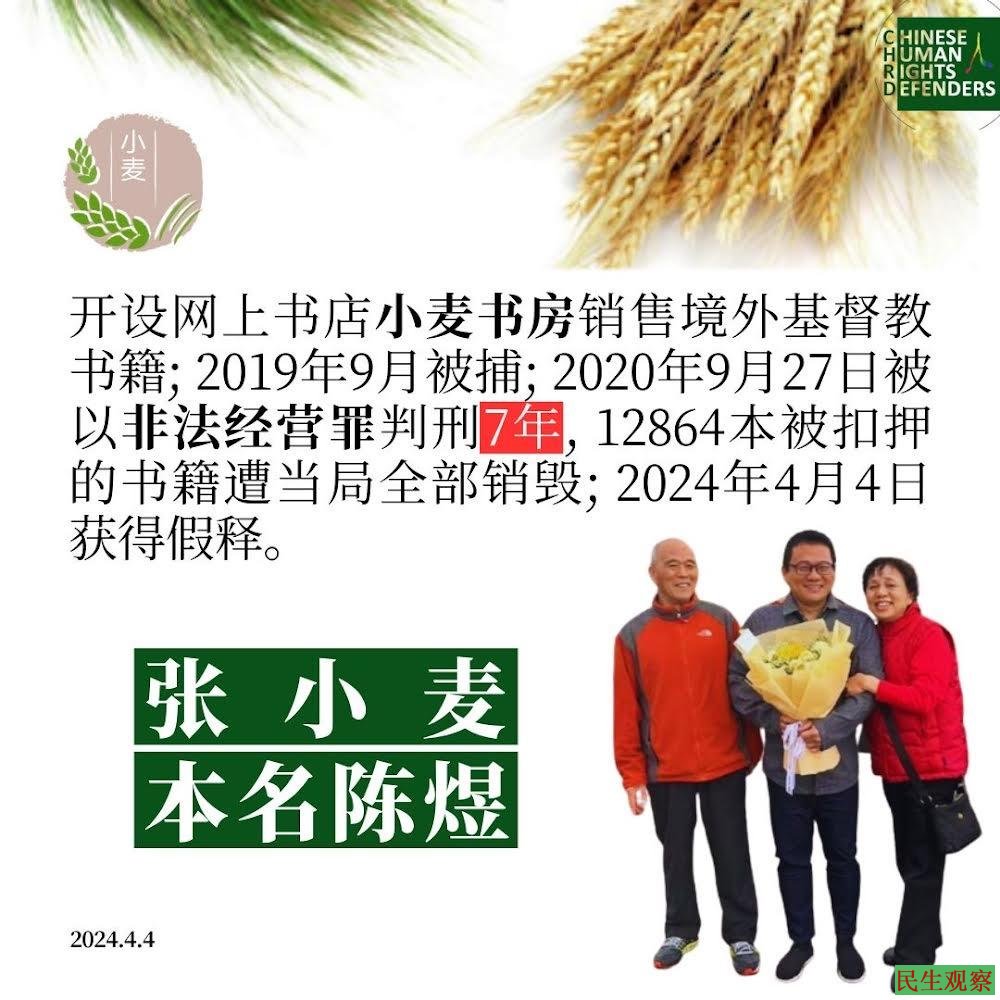 【民生观察2024年4月5日消息】2024年4月4日,浙江台州基督徒张小麦(本名:陈煜)获得假释回家。