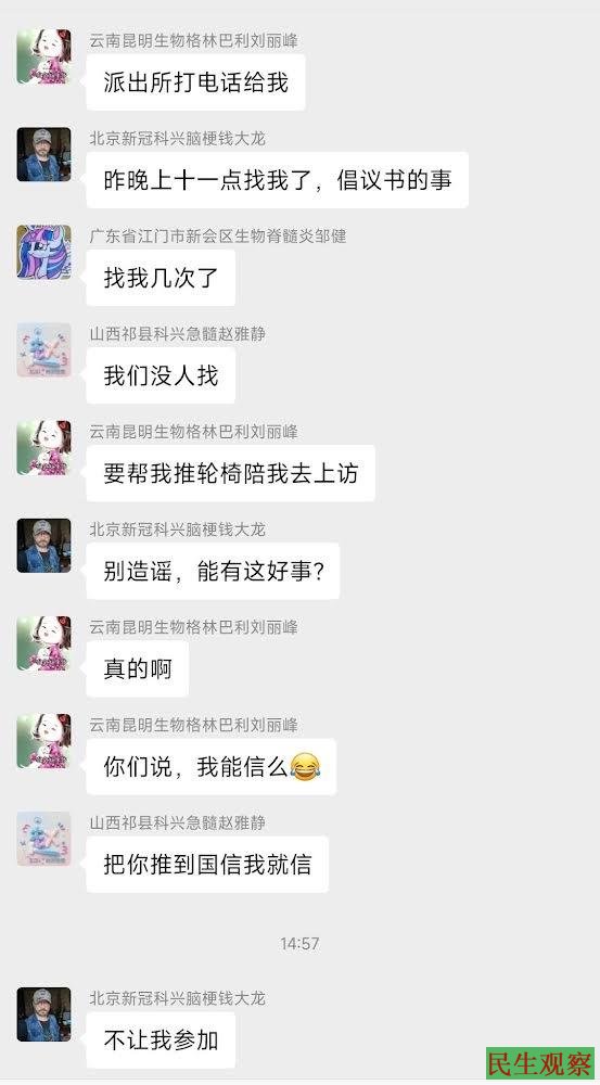 【民生观察2024年6月20日消息】今年7.1前夕,北京又开始重点维稳,尤其是对疫苗受害群体,围追堵截,防止这些人上访提交《呼吁建立“新冠疫苗伤害保障救助机制”倡议书》,不给受害者提交的机会,领导装看不见,中国难道就没有疫苗伤害了。倡议书的三位发起人梁小强已经被判缓刑,钱大龙刑拘取保候审被警告不许参加,邹健刑拘取保候审也被警告老实点。