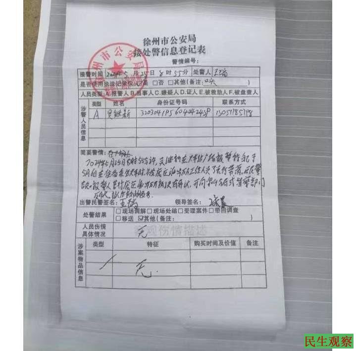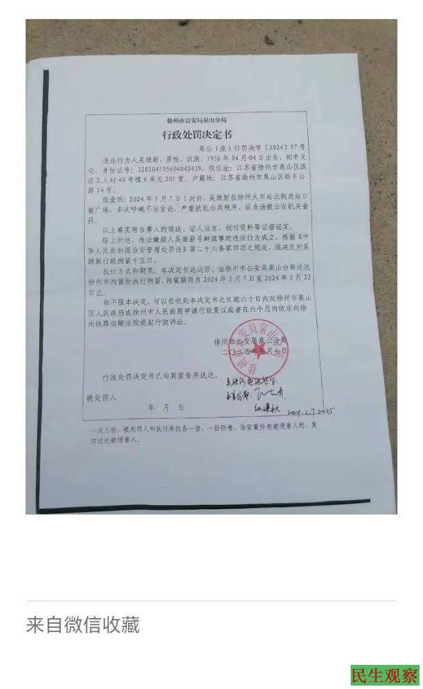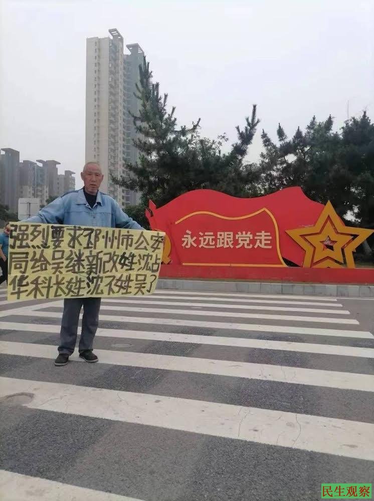 【民生观察2024年7月23日消息】2024年7月16日江苏省徐州市访民吴继新举牌强烈要求邳州市公安局给吴继新改姓沈占华科长、姓沈不姓吴了!邳州市公安局信访科长沈占华科长对吴继新在今年1月2日在徐州市好多地方喊口号没有反对意见,对吴继新到徐州市信访局、徐州市公安局信访、徐州市中级法院信访上访,要求统战部长李世、邳州市公安局局长一把手、邳州市法院院长把手接待,沈占华科长有意见问吴继新说:是谁接待你的姓什么叫什么名字(问好多次态度特别凶)。吴继新说不知道。这些领导没有一个人接结吴继新,沈占华科对吴继新说你到死也解决不了,沈占华科长还叫吴继新改姓沈占华的姓沈。