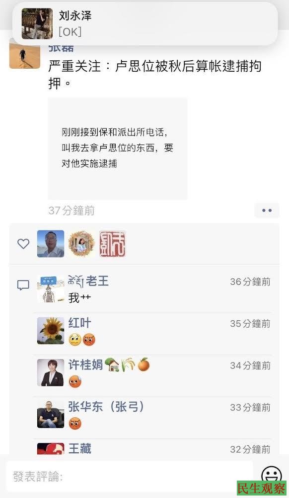 稍后,丁家喜律师妻子罗胜春在X上发文表示,“关注卢思位律师,卢思位被无辜剥夺出境权,好几年无法与家人团聚。去年被遣返后,思位遵守了取保候审的所有规定,当局却依旧处心积虑,趁美国的家人和朋友熟睡之时又将卢思位逮捕,卑劣无耻,猖狂至极!