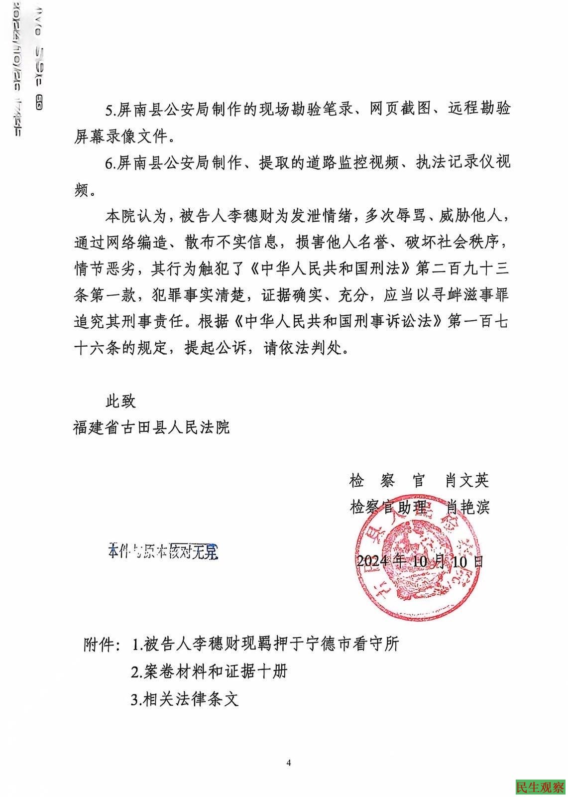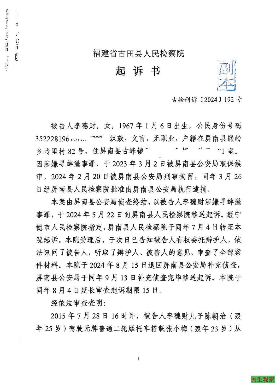 【民生观察2024年11月11日消息】近日家属从纪中久处获悉李穗财被寻衅滋事案件到福建省古田县人民法院,将于2024年11月14日到15日在宁德市中级人民法院召开庭前会议及公开开庭审理。