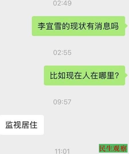 2024年12月20日,有匿名网友投稿反映李宜雪现状,称李宜雪现在被监视居住。监视居住是最危险的,被折磨、羞辱、性侵都是有可能的,希望国内有律师团能帮帮她!