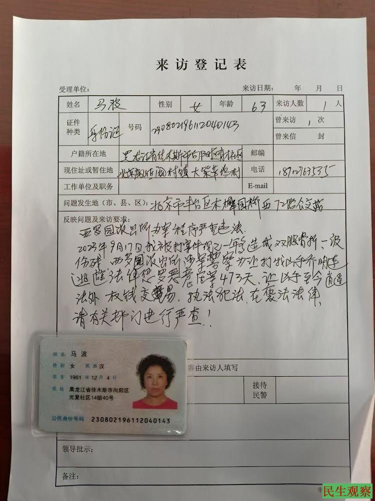 2024年9月25日,马波又去了北京市公安局、丰台区人民检察院、北京市警务督察总队,最后去西罗园派出所给国家信访各部门邮寄信件,投诉西罗园派出所办案程序严重违法,一直压案拖案现已一年多时间,导致打人凶手一直逍遥法外。