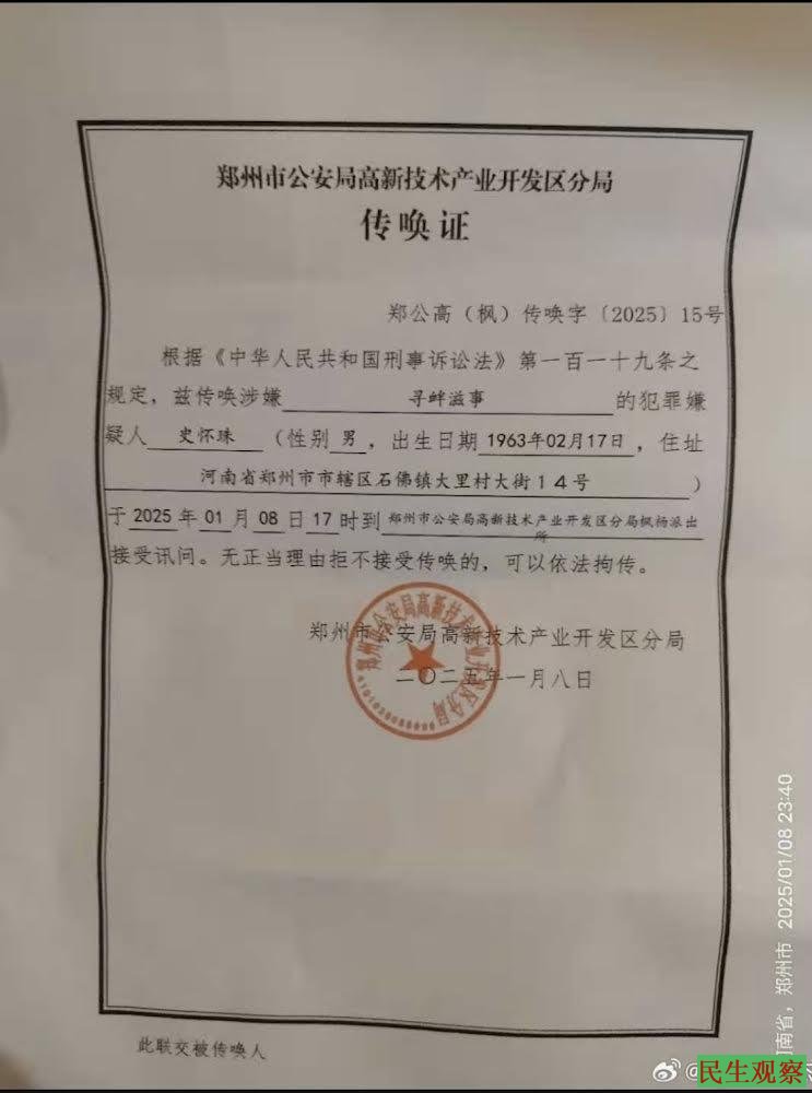 2025年1月8日23点多,史怀珠老师在医学院新城宾馆被郑州市公安局高新技术产业开发区分局(简称:高新区公安分局)两名警号分别为:108877、107873的民警,破门而入以涉嫌寻衅滋事刑事传唤,至高新区公安分局枫杨派出所接受讯问。