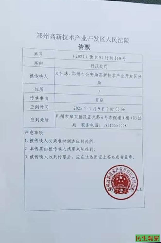 【民生观察2025年1月10日消息】近日,河南郑州高新区公民史怀珠诉郑州市公安局高新技术产业开发区分局(简称:高新区公安分局)一案将开庭审理,但是在开庭前一天,史怀珠却遭到高新区公安分局民警带走传唤,非法限制人身自由直至案件庭审时间过两才将其放出。其目的就是阻止史怀珠的案件无法庭审。高新区公安分局该行为涉嫌滥用职权,严重干扰公民司法活动。