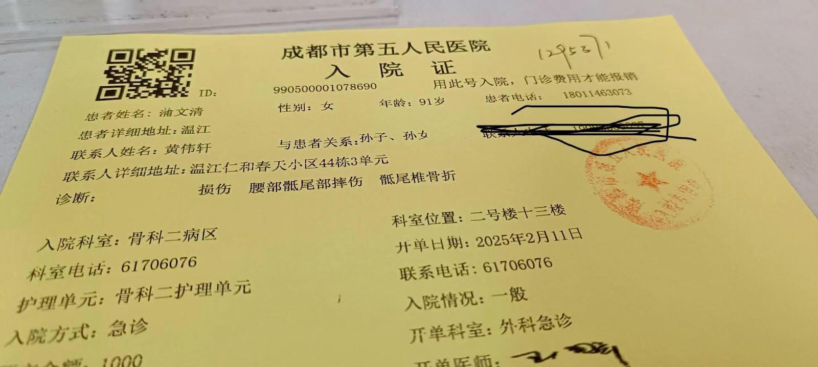 中国四川维权人士黄琦的母亲蒲文清阿姨(91岁)于2025年2月11日入住成都市第五人民医院,诊断为骶尾椎骨骨折。