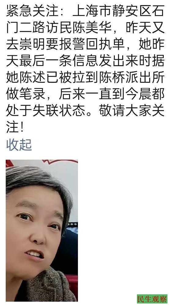 【民生观察2025年5月24日消息】近日,上海静安区石门二路访民陈美华去派出所索要报警回执后失联至今,其最后所在的位置是陈桥派出所,之后一直处于失联状态。目前,家属已向石二派出所报案,且已拿到了报警回执单。