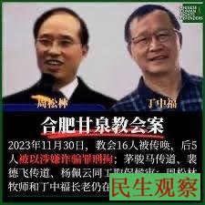 【民生观察2025年5月24日消息】合肥甘泉教会周松林、丁中福两位牧长被控诈骗罪一案,将于2025年5月26日至28日开庭。近日,教会多位弟兄姊妹不同程度的遭到地方相关部门的施压、骚扰、威胁、恐吓,目的是阻扰弟兄姊妹参加此次庭审的旁听和作证。
