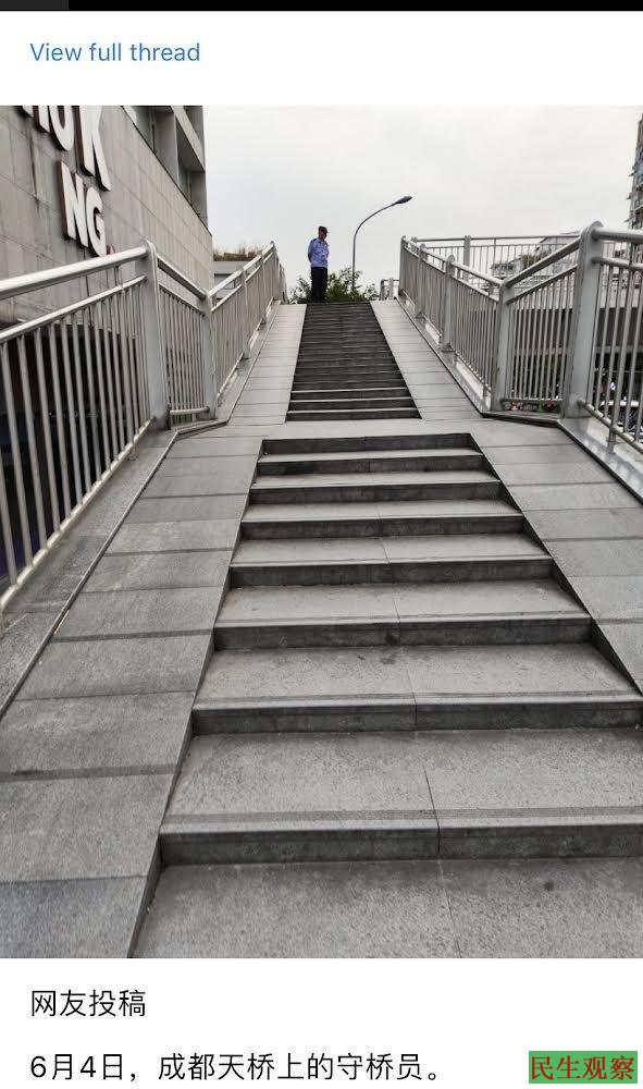 6月4日,一张图片显示成都天桥上被安排了守桥员。