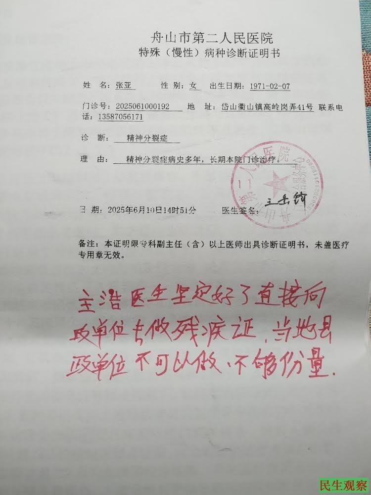 【民生观察2025年6月23日消息】近日,浙江省舟山市岱山县衢山镇维权访民张亚,突破阻碍来到杭州市,向中央巡视组递交了举报材料。其举报内容为,自己在今年6月上旬,因维权被衢山镇政府人员打伤并关押,获释后至今家门口24小时被人看守监视,连出门去看病都不允许。