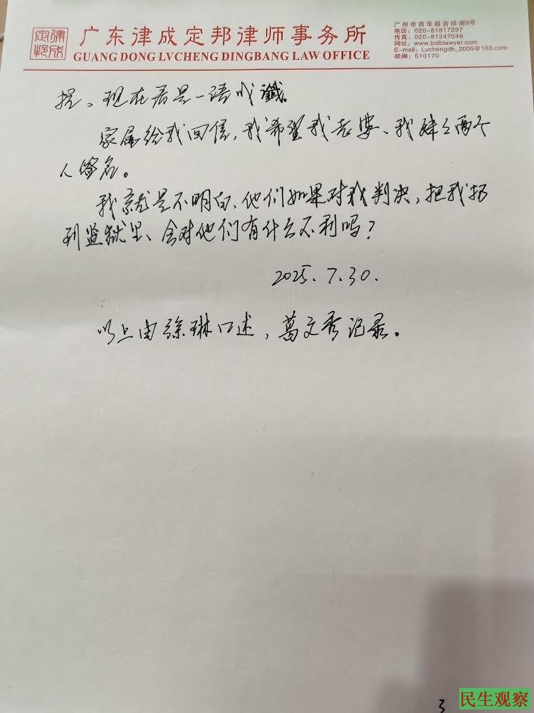 【民生观察2025年8月3日消息】近日,葛文秀律师前往南沙看守所会见了徐琳。因食物及卫生条件恶劣,导致徐琳身体严重营养不良,暴瘦至不足100斤;身体多处病痛:乳腺肿块及牙穿孔。广州南沙看守所非但不提供医疗,还剥夺徐琳的通信权。当局久拖不判,是为打击报复,在看守所施行严酷折磨,徐琳表示将力争权利,不排除以命相搏!