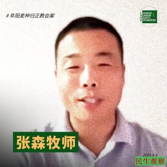 【民生观察2025年8月5日消息】阜阳麦种归正教会的张森牧师于今年7月9日在外省访友时被抓,带回阜阳后遭到刑拘至今未放。近日,张森牧师妻子徐超师母发出代祷信,恳请弟兄姊妹为其案件代祷。