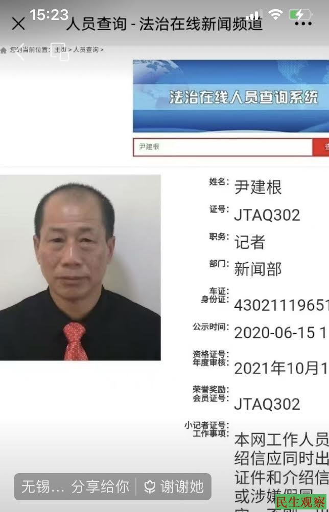 据悉,尹建根,网名“笔耕下的阳光”,法治在线的记者,住湖南株洲市荷塘镇桂花社区。笔耕,侠肝义胆,长期关注底层民生问题,为维权人士发声……