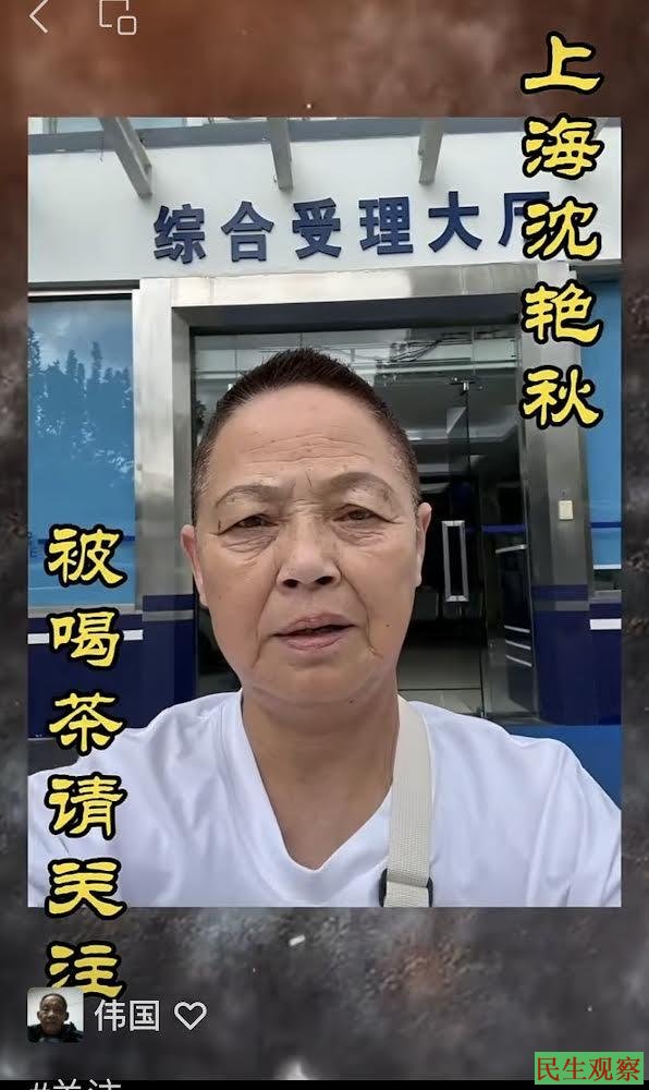 2025年9月19日一大早,上海公民沈艳秋被上海虹口区凉城派出所请“喝茶”!据悉,今天张展案开庭,上海市公安局统一部署维稳,一大早沈大姐就被叫去派出所喝茶。至下午时分,沈大姐才被放出派出所。