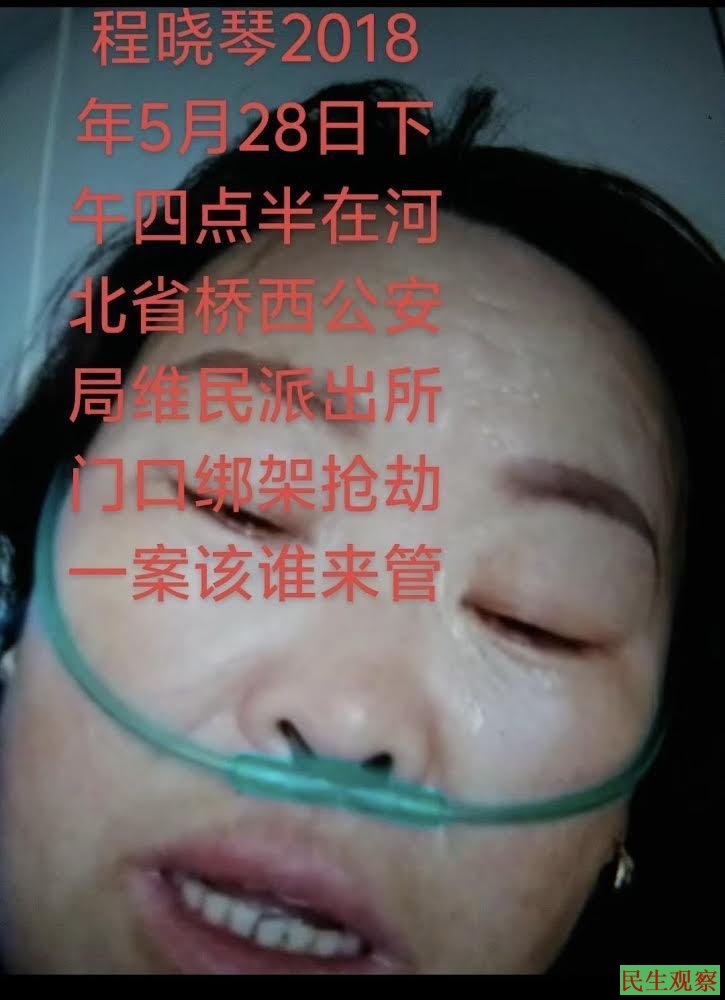 2018年5月28日下午4点半,在维民派出所发生一起绑架抢劫案,目击证人贾太青拍下抬走程晓琴和张子花的视频,手机被绑架他们的人抢走,至今没有归还手机,目的是毁灭证据。上述三人反映了长达七年时间一直没人管。