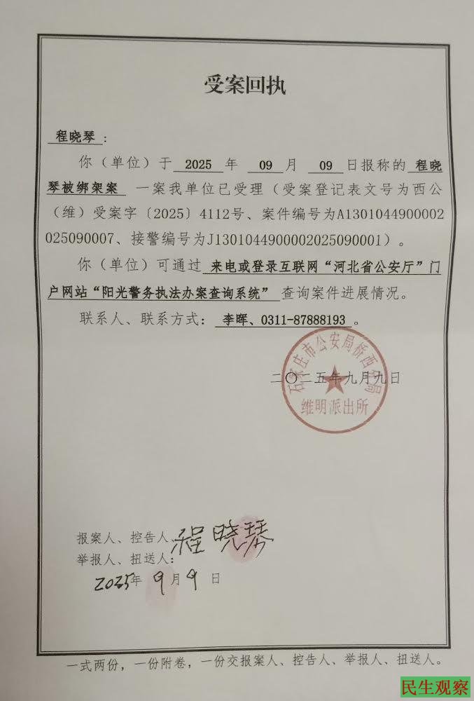 2025年6月,程晓琴向中央第七巡视组控告,河北省桥西公安局局长刘力军、维民派出所现任所长彭猛、原任所长魏平山、法制科负责人李晖,严重渎职不作为乱作为,执法犯法徇私舞弊,给黑恶势力充当保护伞办金钱案。
