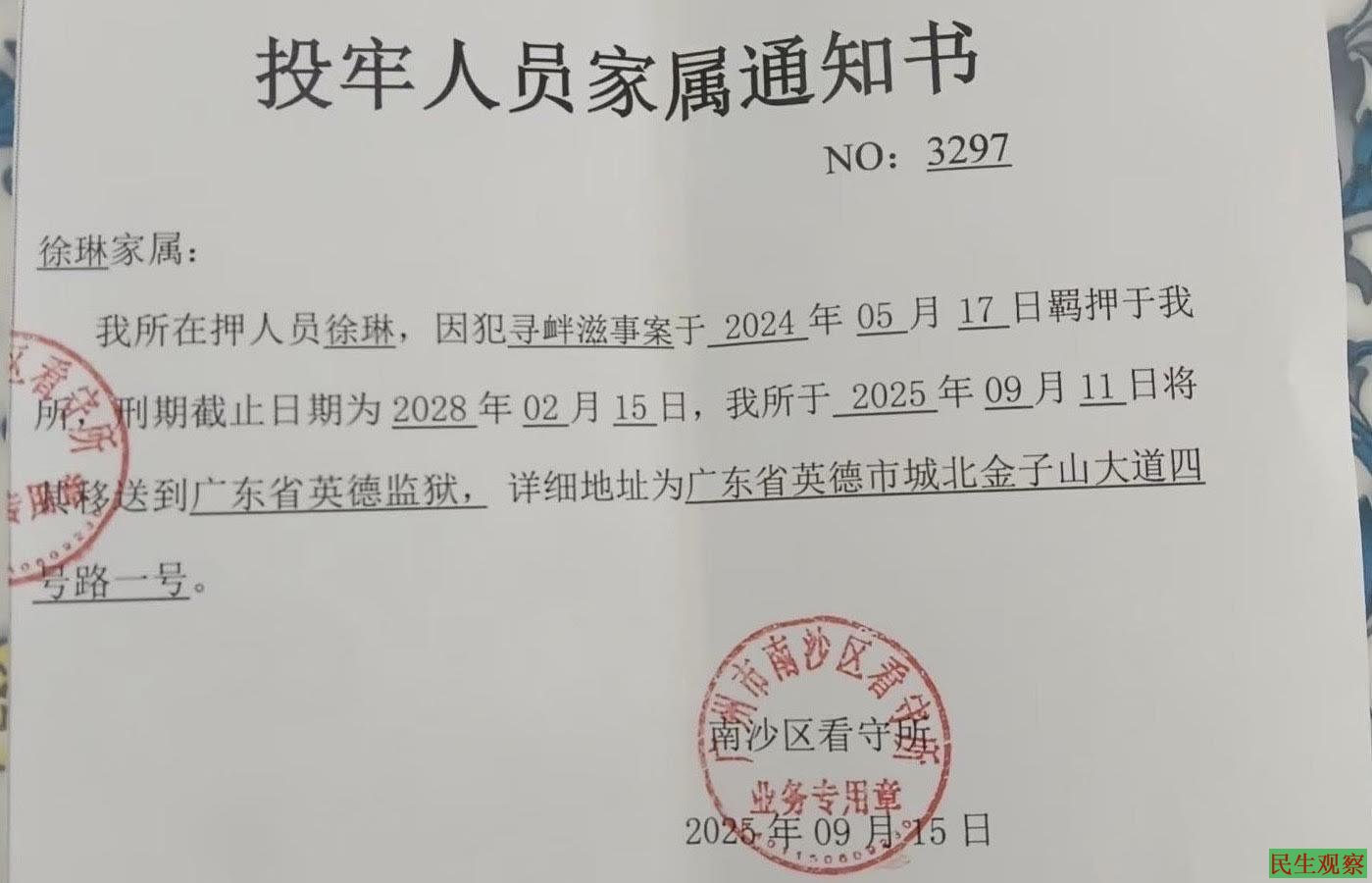 广州市南沙区看守所于2025年9月25日出具了通知书,告知家属徐琳因犯寻衅滋事案于2024年5月1日羁押于该所,刑期截止日期为2028年2月15日,该所于2025年9月11日将徐琳送到广东省英德监狱。详细地址为广东省英德市城北金子山大道四号路一号。