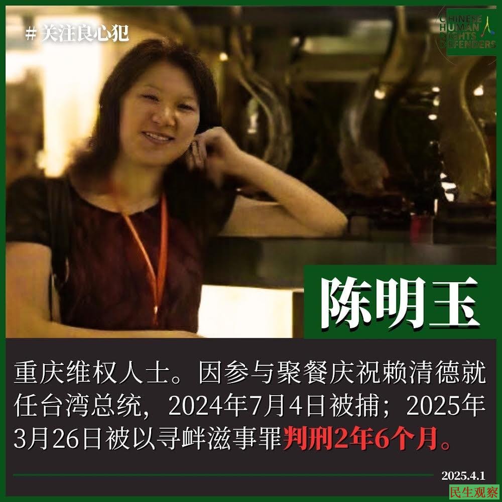 2024年5月20日,赖清德就任台湾总统当天,重庆二十多名维权人士聚餐庆祝,之后均被当局传唤,多人被拘留,陈明玉也参与了聚餐。