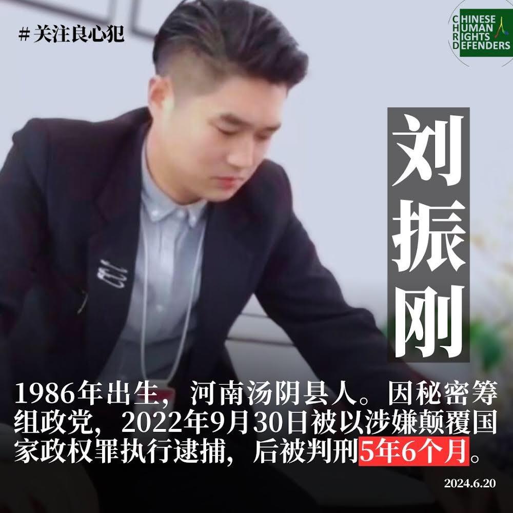 公开资料显示,刘振刚,1987年9月9日出生,河南省汤阴县菜园镇人,江苏省苏州市吴江区长安路星宝花园常住公民,网名“南宫道人”、“刘子德”,中国民主胜利党(属秘密组党)重要成员,“泸州2022大抓捕案”受害者,中国在押政治犯。