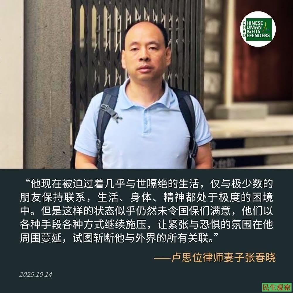 【民生观察2025年10月16日消息】四川成都人权律师卢思位被以涉嫌偷越国(边)境判刑11个月,于今年8月5日刑满释放。获释后的卢思位仍无法获得人身自由,今年国庆中秋期间,回老家探亲的思位一直被一辆汽车跟踪监视。另外,卢思位近日前往成都检察院和法院就其案件递交了刑事控告状和申诉状,要求依法追究办案人员的刑事责任,改判自己无罪。